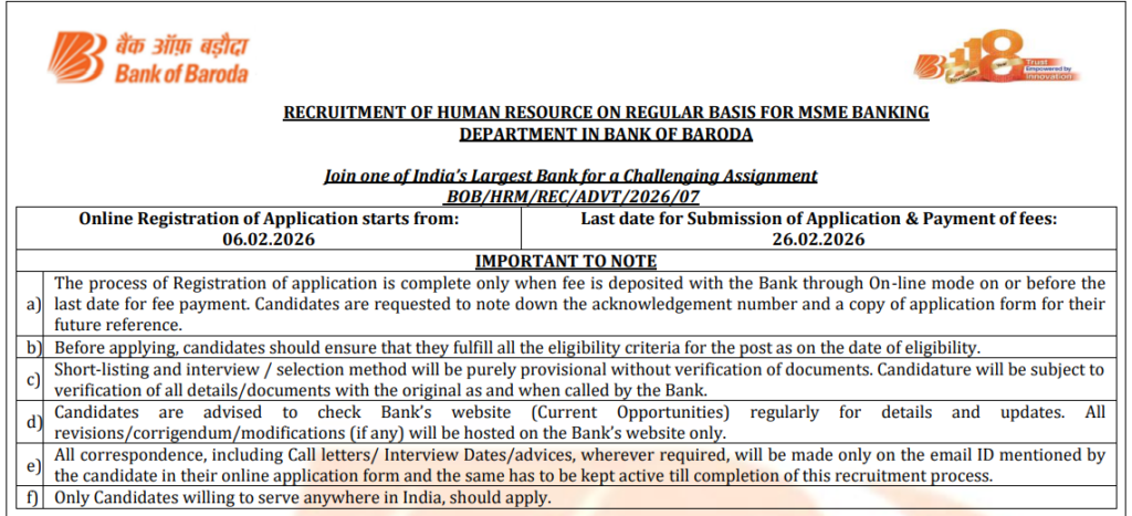 Bank of Baroda Recruitment 2026: ने 2026 में 166 Manager और Senior Manager के पदों के लिए भर्ती निकाली है। ये सभी पद बैंक के MSME Banking विभाग में हैं। अगर आप इस क्षेत्र में अनुभव रखते हैं और सरकारी बैंक में काम करना चाहते है, तो ये आपके लिए शानदार मौका है। ऑनलाइन आवेदन 6 फरवरी से 26 फरवरी 2026 तक खुले हैं।