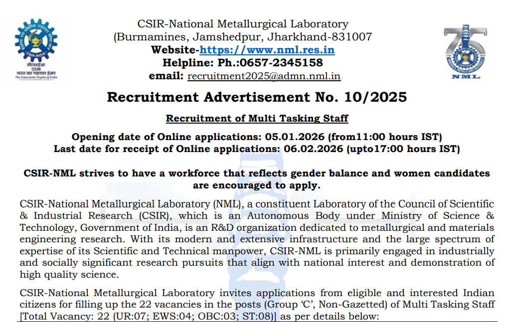 A.CSIR – National Metallurgical Laboratory ने साल 2026 के लिए मल्टी टास्किंग स्टाफ (MTS) पदों पर भर्ती का नोटिफिकेशन जारी किया है। इस भर्ती के तहत 10वीं पास उम्मीदवारों को सरकारी नौकरी पाने का मौका मिलेगा।