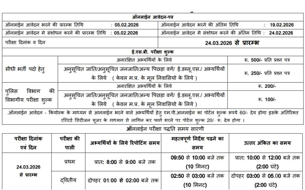 ऑनलाइन आवेदन प्रक्रिया 5 फरवरी 2026 से शुरू होगी। योग्य उम्मीदवार तय समयसीमा के भीतर esb.mp.gov.in वेबसाइट के माध्यम से आवेदन कर सकते हैं।